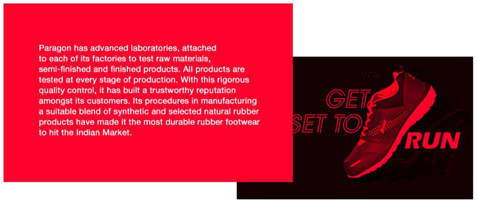 As a brand that sells all over the country, Paragon needs little or no introduction in the Indian sub-continent. While rubber footwear continues to be its leading product, the Paragon brand name brings its longstanding assurance of quality and durability to a full range of other footwear products made of Poly-Urethane (PU), Poly Vinyl Chloride (PVC), Ethylene-Vinyl Acetate (EVA) and Thermo Plastic Rubber (TPR) soles too. Paragon also has an in-house footwear design team dedicated to creating new designs and models to keep up with market demand.